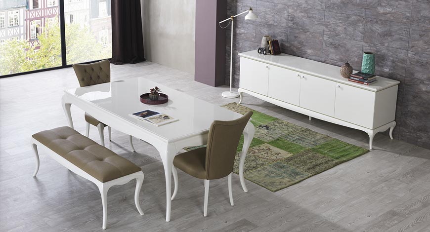 Beyazın saflığını yansıtan yemek odası, zarif tasarımı ile evinize sakin bir hava katacak.